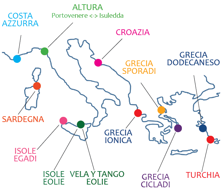 | La Nuova Rotta di Ulisse: Grecia Ionica -> Egadi -> Eolie -> Pontine e Flegree | 7/14/21/28 giorni | Corfù, Lefkada, Zante, Palermo, Trapani, Milazzo, Nettuno, Procida | da Giugno a Settembre |